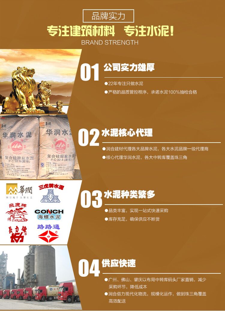 佛山市潤合建材公司 簡稱:廣東潤合。專注水泥22年生產(chǎn)/批發(fā)。主營:PC32.5R、PO42.5R、P1142.5R、PO52.5R華潤水泥、三虎水泥、海螺水泥、飛鹿水泥、路路通水泥、長力水泥。及C20、C25、C30、C35、C40、等C60以下混凝土。各大水泥品牌,在水泥采購商中享有較高的品質(zhì)認可,廣東潤合與多家世界500強企業(yè)中鐵、中交、中國建筑和知名房企保利地產(chǎn)、碧桂園地產(chǎn)、龍光地產(chǎn)、美的地產(chǎn)長期合作。各品牌水泥有較大價格優(yōu)勢,及水泥運輸配送優(yōu)勢。佛山潤合水泥建材公司,將以薄利多銷及全心全意服務(wù)每位客戶。